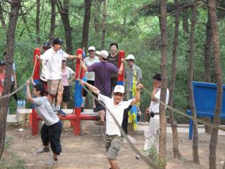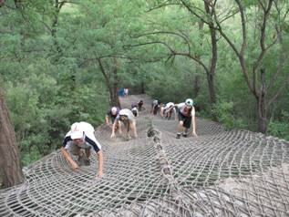 接下来,经过短暂的休整和准备,我们开始了为期一天半的野外拓展训练。在这里,每个项目都离不开团队的支持和鼓励,在一开始组织团队,选队长、队名、队旗、队标的过程就预示了此次活动的整个过程离不开集体的智慧和力量。在教练的带领下,我们的两个团队以一曲手语《中国人》开始了本次活动的征程。
