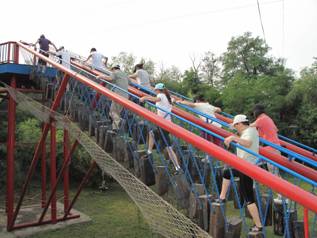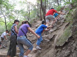 山地训练营,步步高、晃桥、暗道、爬铁索、走钢丝、曲径通幽、爬网……,一路走来,两队选手斗智斗勇,终于登上了顶峰——瞭望塔,站在瞭望塔上极目远望,怀柔美景尽收眼底。