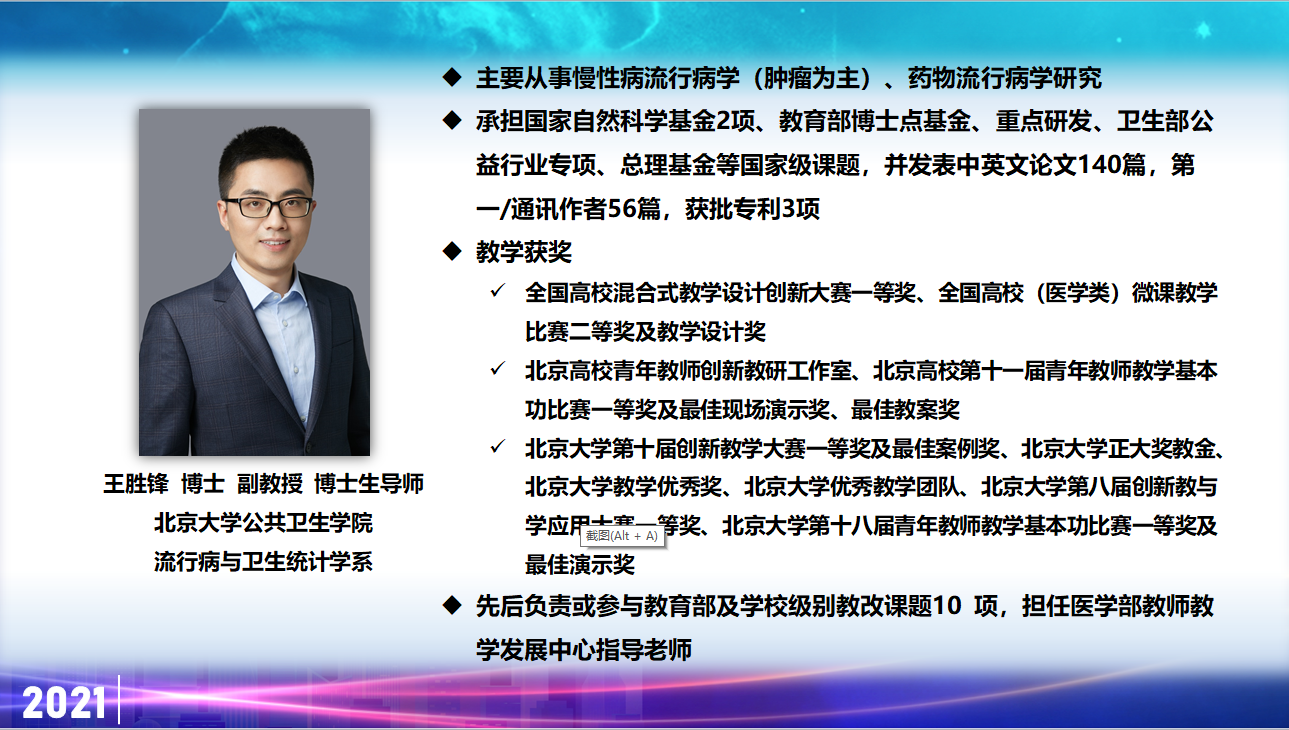 20211228日,350vip浦京集团官网双语教学兴趣小组邀请流行病与卫生统计系王胜锋老师分享案例教学和混合教学的经验和体会。350vip浦京集团官网50余位老师和同学参加本次讲座。学院党委副书记、工会主席詹思延出席,兴趣小组组长吴涛老师主持讲座。