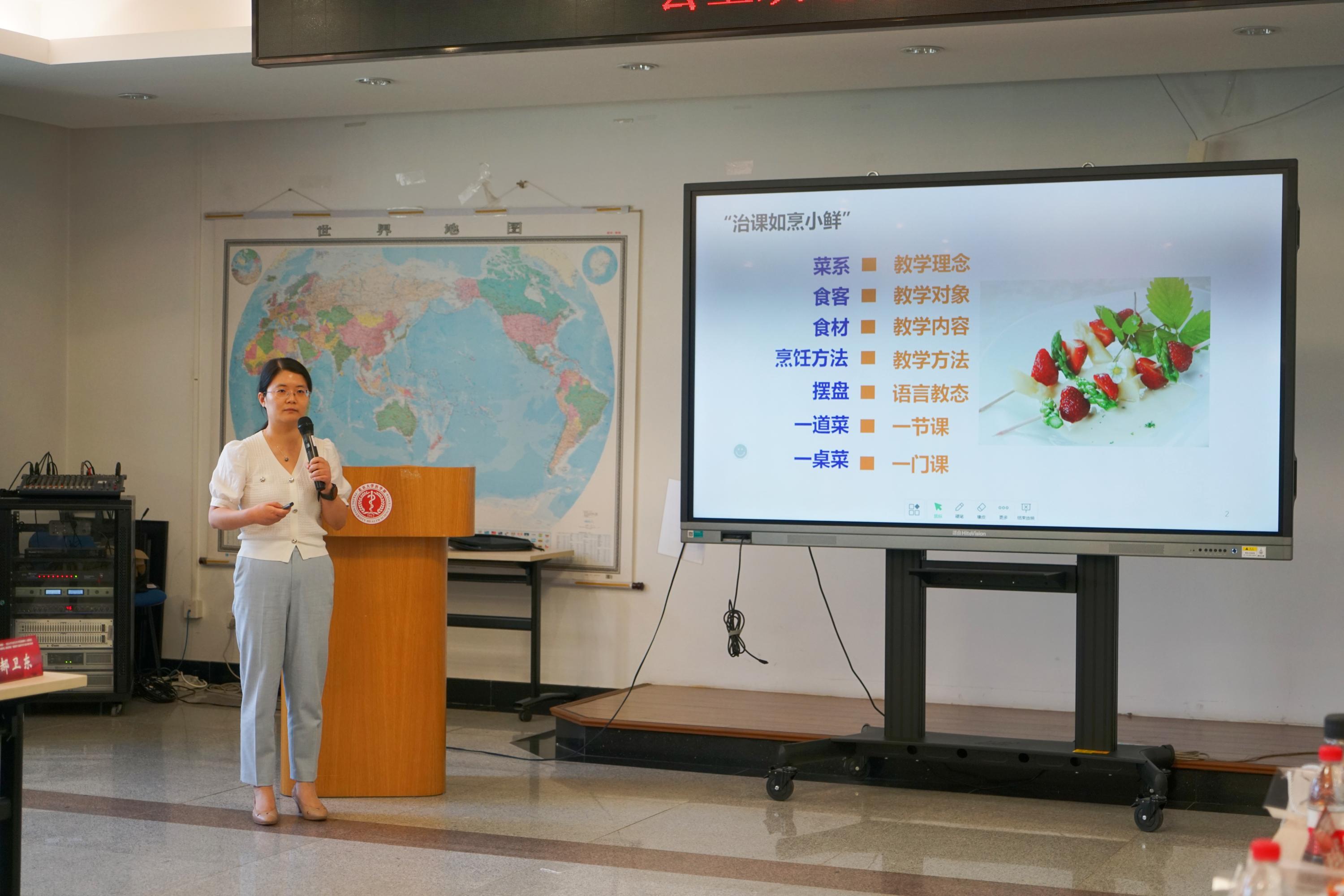 劳动与环境卫生学系黄婧副研究员结合自己获奖用过的课程教案,以“治课堂若烹小鲜”的理念介绍了一节课教学过程、重难点讲解方法和教学原则等教育教学经验。
