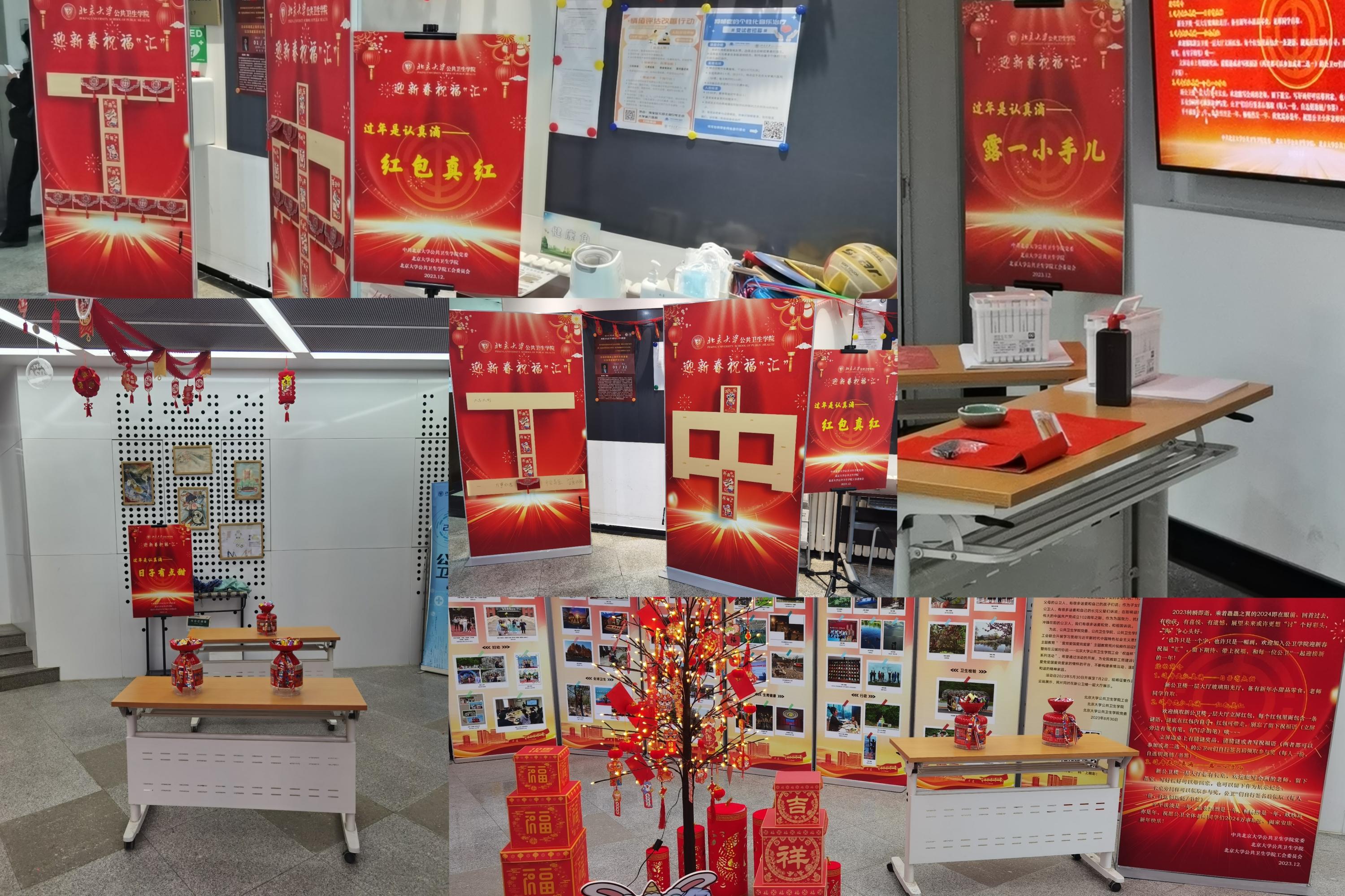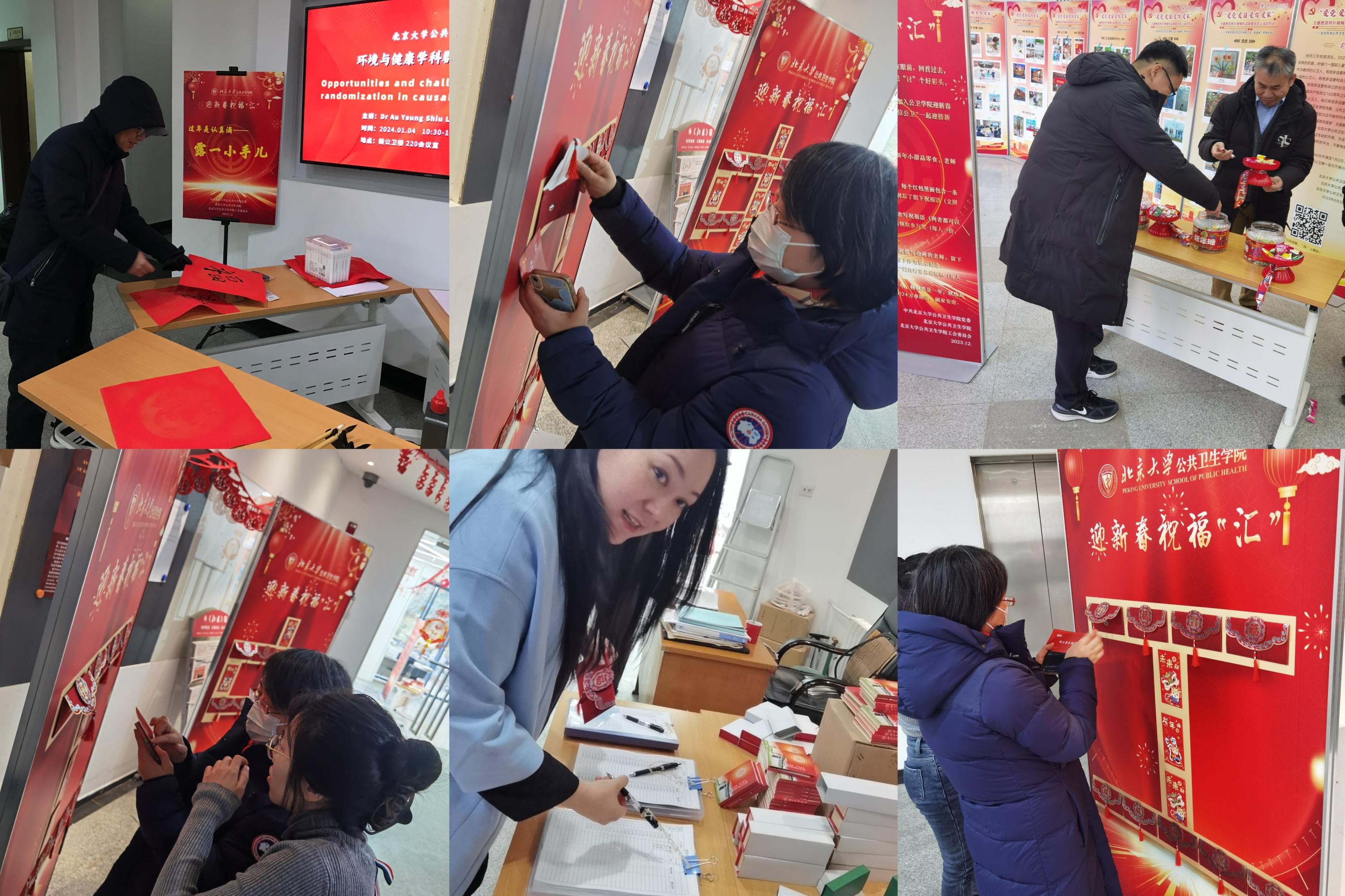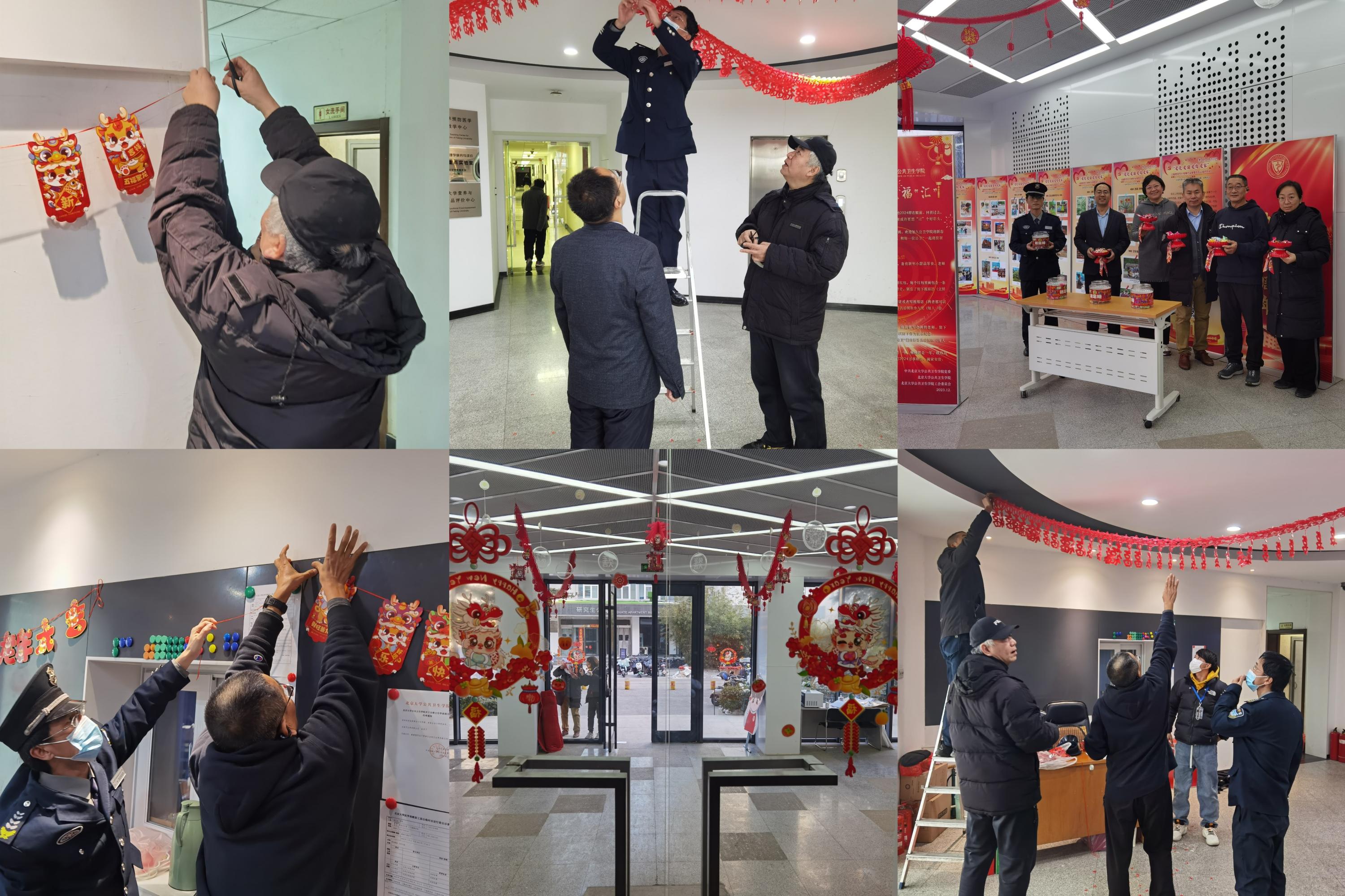 12月28日下午,新公卫楼一层玻璃阳光大厅及室内大厅一派喜庆,学院工会干部、老师、保安等一起,撸起袖子,热火朝天,用窗花、糖果、彩链装点环境;巧手的同学们随后继续贴窗花、挂灯笼,整个大厅内洋溢着火红的节日氛围。