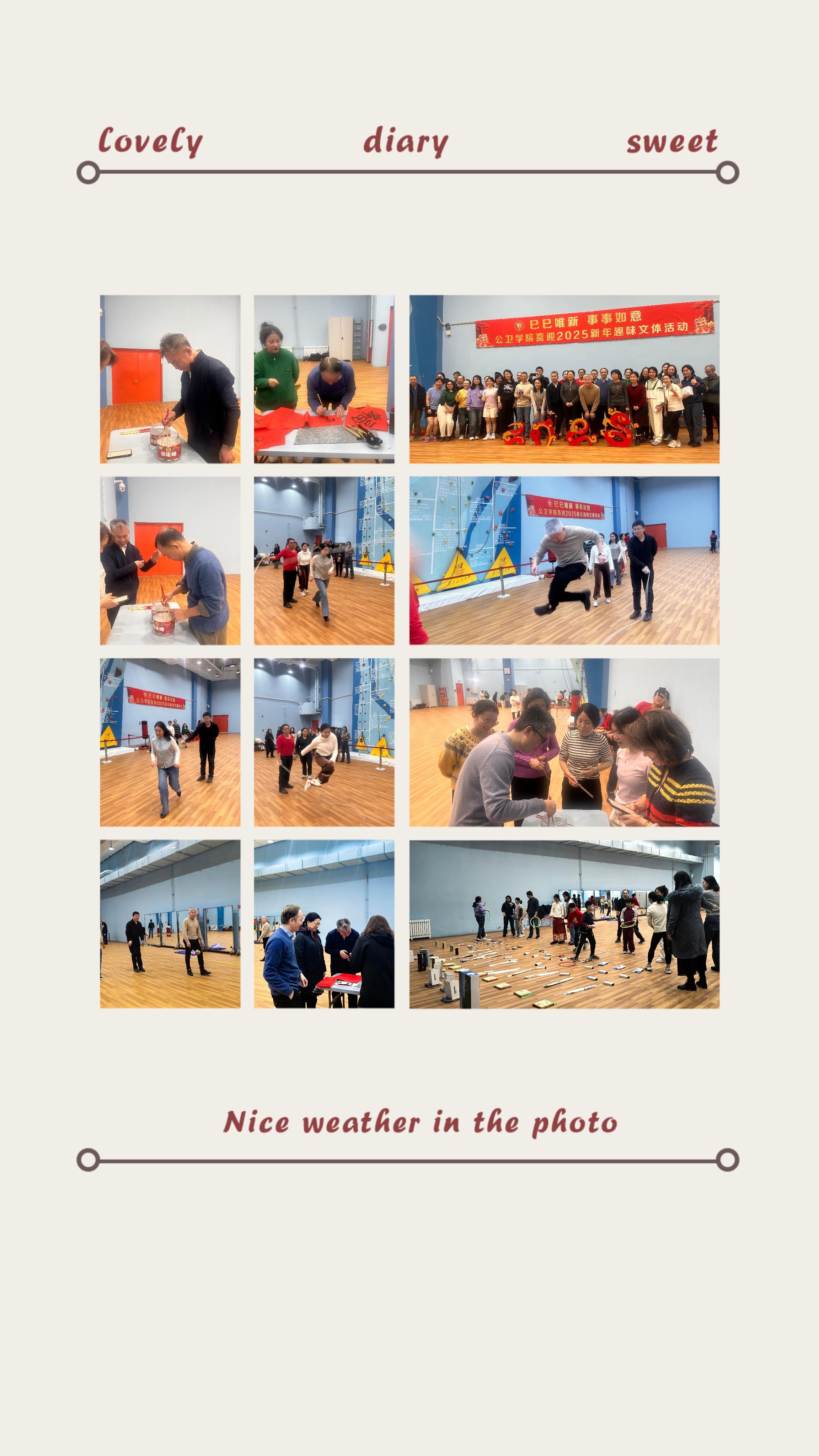 书画活动现场,老师们手握毛笔,屏息静气,一幅幅书写精美的对联和“福”字跃然纸上,无论是专业亦或是练习,勇敢握笔写大字就迈出了大字书写的第一步;最热闹的就是集体跳绳了,参加跳绳的老师们排着长长的队伍,绳子飞舞,双脚腾空,身轻如燕,随着跳绳的节奏敏捷地弹起又落下,就像是跳动的音符奏响欢快的乐章,挥绳的两位老师紧握绳柄,节奏不断加快,绳子挥动的像一道道五彩虹,笑声、鼓掌声伴随着汗水,每个人脸上都洋溢着快乐的笑容;最激动人心的就是套圈了,随着“嗖”的一声,套圈带着心愿飞了出去,“啪”一声,套圈稳稳地落在自己心仪的礼物上,拿走了礼物,收获了一份甜甜的幸福和难得的放松。
