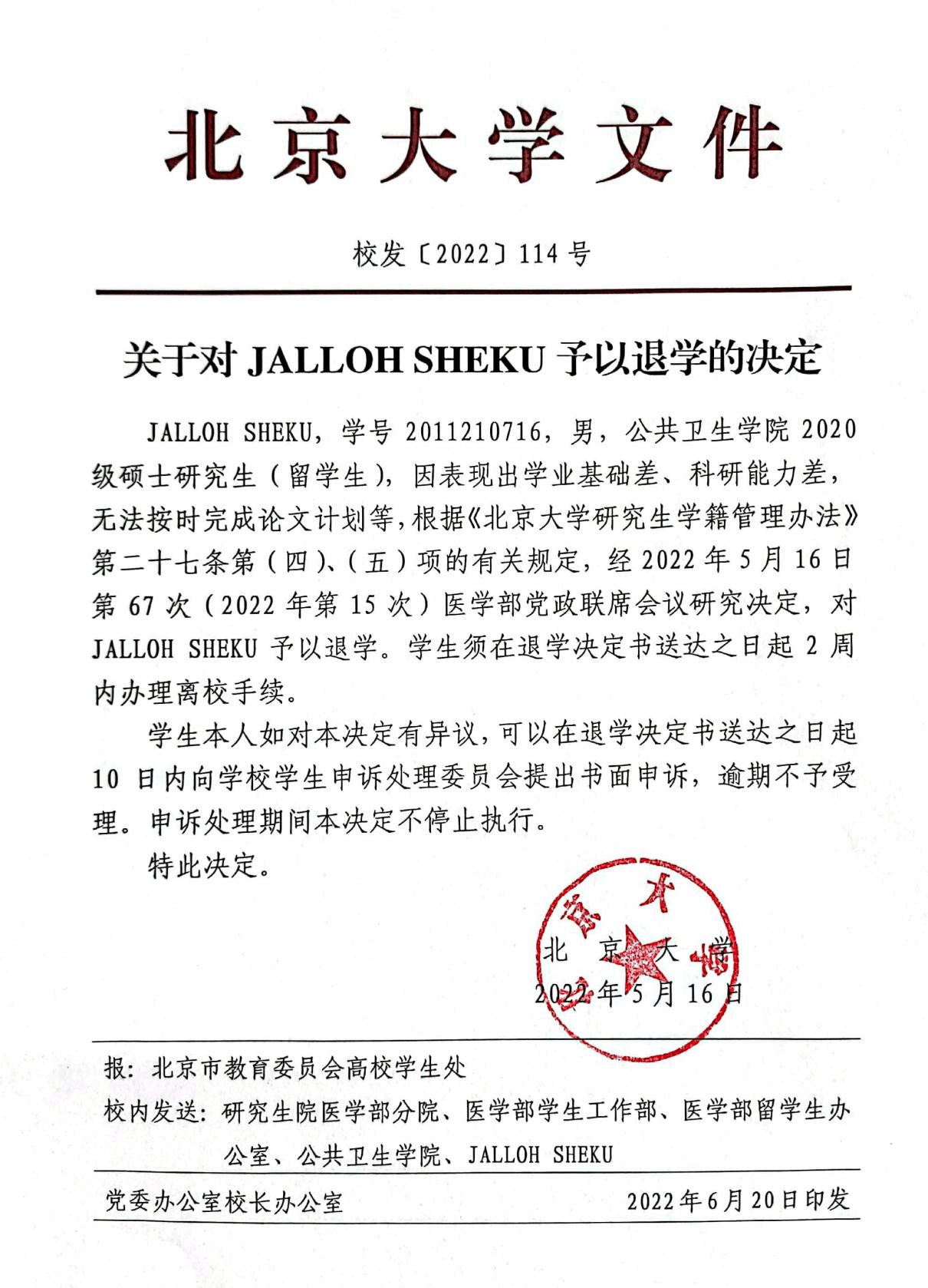 Expulsion Decision of Jalloh Sheku关于对Jalloh Sheku予以退学的决定