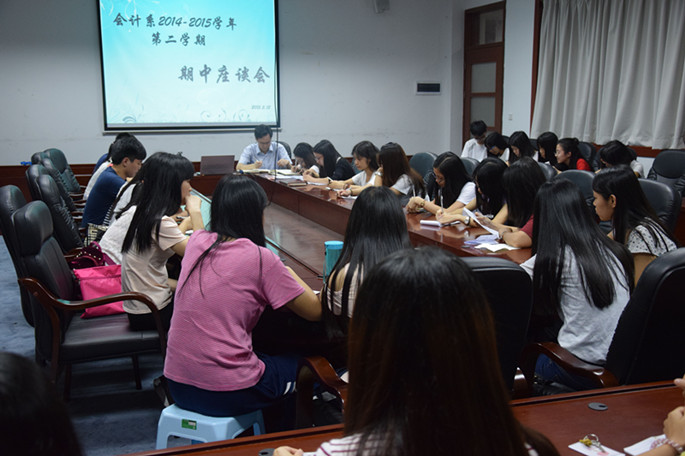 为全面了解会计学子课堂学习状况和专任老师课堂教学效果,会计系于5月12日晚在D308举行了期中教学检查学生座谈会。会计系党总支书记李锦堂,辅导员汤振华、陈秀纯、吴梦、罗彩玲,教务员袁翠珍和31个班级63名学生代表参加了座谈会。
