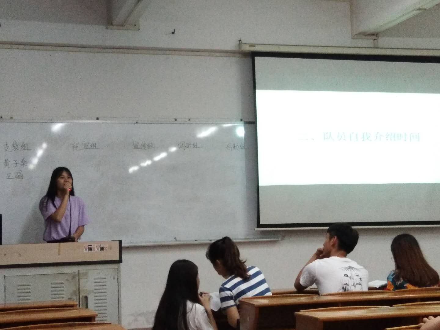 见面会开始,队员们依次上台进行自我介绍,使得队员们之间有了初步的认识,大大增进了三下乡团队的情谊。经过一轮的自我介绍,大家都对三下乡充满了期待。随着时间的推进,来到了竞选组长的环节。队员们踏着坚定的步伐走上讲台,自信满满的为自己拉票,紧随在后的投票环节更是将见面会的气氛点燃。