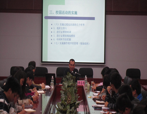 2011年12月1日晚会计系在D208举行学生干部培训会,学院党委书记谭马利作 “校园活动策划与实施”主题讲座。学院党委委员、学生处副处长何伯略、计算机系党总支书记钟远辉、会计系辅导员出席了讲座,讲座由会计系党总支书记李锦堂主持。