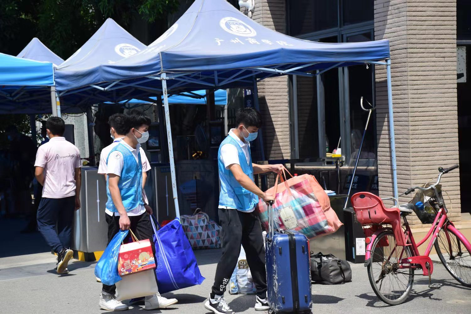 报到当天,在北门入口,志愿者引导返校学生到学校门口的安检通道对行李进行喷雾消毒、手部消毒,配合进校前体温检测和核查身份,并帮助返校学子搬运行李,展示青年学子朝气蓬勃面貌,为学生提供温暖贴心的服务。学校为志愿者工作人员准备绿豆糖水降温防中暑。校院严格把控学生返校各个流程的工作,确保学生安全,让学生感受到回家的温暖。