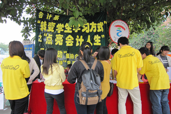 会计系首届“点亮会计人生”系列活动旨在让会计学子们了解更多知识,打好扎实专业功底。为了让广大师生对“点亮会计人生”系列活动有更深入的认识,2011年3月11日中午11:00~12:30与下午5:00~6:30期间,会计系团委秘书处、网络部、编辑部三大部门成员在西饼屋对面竖起了“点亮会计人生”的鲜明旗号,进行了火热的摆摊宣传活动。