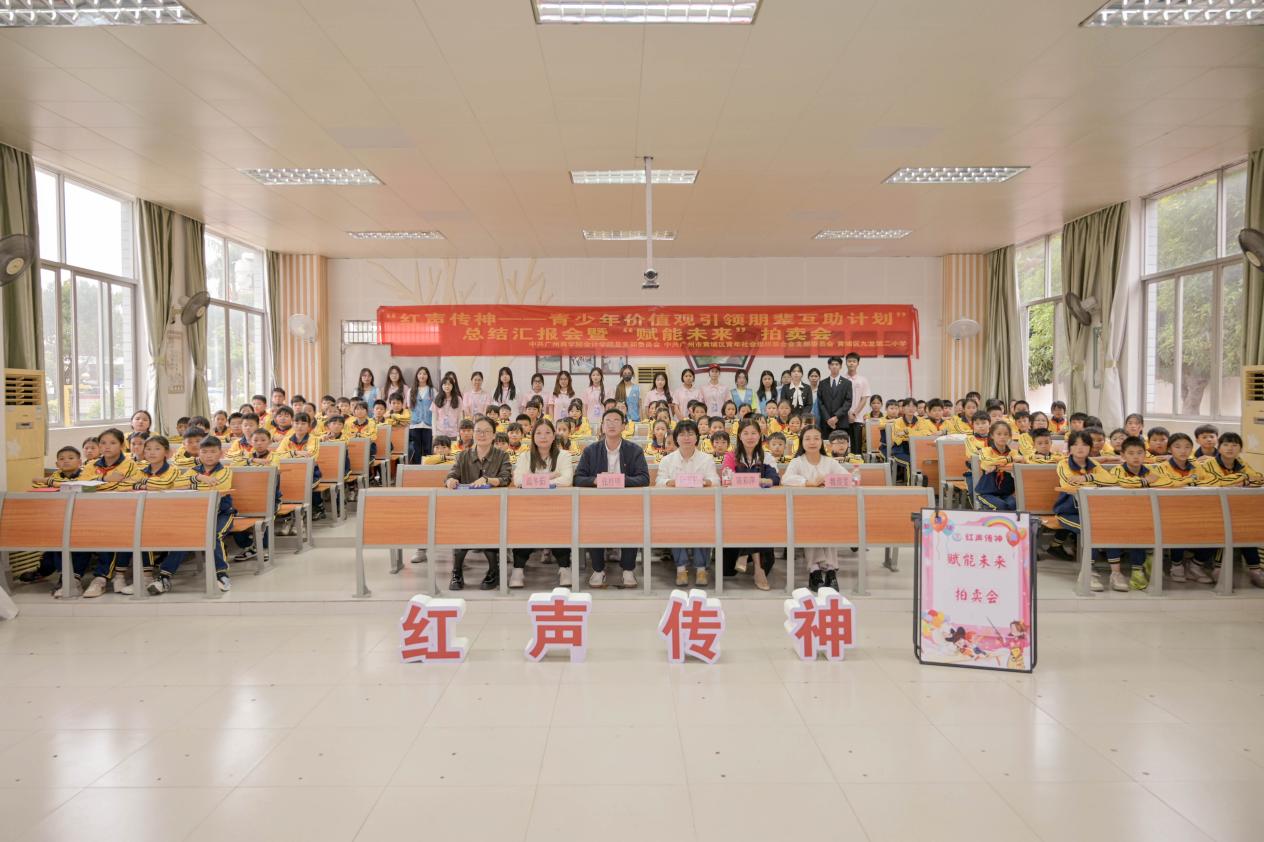 为深入贯彻党的创新理论,厚植青少年家国情怀,推动红色教育融入青少年成长日常。中共广州市黄埔区青年社会组织联合会支部委员会联合广州商学院Beat365官方网站会梦起航服务队,在广州市黄埔区九龙第二小学,2025年10月至12月期间,广州商学院Beat365官方网站会梦起航服务队在广州市黄埔区九龙第二小学五年级(2)班和五年级(3)班同步推进“红声传神——青少年价值观引领朋辈互助计划”第四期课程,并于12月23日成功举办第四期“红声传神——青少年价值观引领朋辈互助计划”总结会暨“赋能未来”拍卖会。