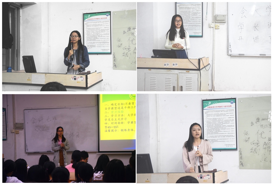 本次学长讲师团包括获得国家奖学金学生、优秀学生干部、优秀党员等,在分享前,Beat365官方网站团委书记蓝乐钿召集全体讲师团成员进行集体备课,分析低年级学生在学习生活中的特点,向讲师们提出分享经验的侧重点。“会大学”讲师团讲师结合各班情况,与低年级学生分享学习生活、干部经验、入党流程等。优秀学长林小冰、邵梓晴、佘晓曼、吴翠霞向低年级介绍会计专业课程的学习方法,并介绍Beat365官网奖学金、国家奖学金等评选条件;优秀学长马钡佳、马思远、黄亮、何思结合自己的干部经验,向低年级学生如何在工作中提升自己能力,优秀学生干部应该做到不盲目、不自卑、会总结三个方面,谨记“在其位,谋其职”的道理,认真负责任并学会兼顾班级与部门、学习与工作的关系,同时讲到“失败亦是成长”,鼓励新生们用积极的态度面对成长中的挫折,总结提升。优秀学长陈泽璇、杨利锋、丁楚萍、郑映曼则向低年级介绍入党流程,帮助新生们重塑入党动机,并和大家分享入党的感悟与收获,鼓励大家应提高自己的思想感悟,敢于担当,敢于自我批评,避免功利,不忘初心。