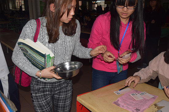 “光盘”是每一个人都应做到的事。在活动期间,每天中午由学生会干事在同乐园二楼进行摆摊宣传和盖章工作,只是拿着空盘到饭堂回收点,便可以宣传处盖章。在本次活动中我们采用集章的方式来调动同学们参与活动的热情,由工作人员发放专门的集章卡片,同学们只要在卡片上集齐七个章便可换取精美奖品。我们开创了新的宣传方式——转发活动链接并在朋友圈集赞,集够相应的赞数也能获取一份小礼品。当我们向同学们宣传此次行动时,他们都会驻足倾听且表示支持,并有很多同学都能够主动地参与到此次的光盘行动。朋友圈集赞的方式提升了同学们对此次行动的积极性,同时也扩大了此次行动的影响力。同时,于3月24日17时在舞蹈室旁的校道举行了光盘签名活动,使更多同学参与到此次活动中,留下自己的签名,书写光盘的决心。