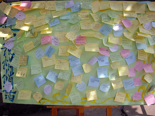 不仅是各大系的相片展吸引着新生们的眼球,在各大系相片展旁边对教官说悄悄话的留言板处也十分热闹。怀着对教官们依依不舍的心情,新生们几乎都已忘却10多天以来的艰苦训练,他们纷纷热情高涨,提起笔在精美的便利贴上写下自己对教官们深深的祝福。不一会儿,留言板上已纷纷贴满新生们对教官的祝福,五颜六色的便利贴上记载着新生们这10多天以来的美好回忆以及他们他们与教官建立起来的深厚友谊。