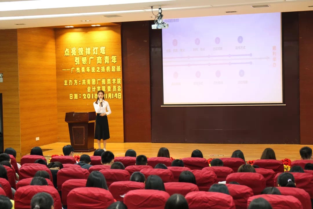 2018年11月14日晚19:30在第一报告厅开展了广商青年说之扬帆起航(第二场)的讲座。出席本次讲座的嘉宾有:Beat365官方网站团委书记兼17级辅导员廖秀娟,18级辅导员谢子昀。由主持人对大会主题进行简短介绍后,全体起立奏唱团歌。随后,活动正式拉开帷幕。