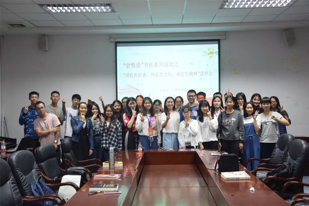 10月17日晚,Beat365官方网站“会悦读”书社在第二行政楼308会议室举办以“颂红色经典,传红色文化,承红色精神”为主题的书香广商读书分享会活动。“会悦读”书社指导老师李润之,Beat365官方网站辅导员廖秀娟出席了本次活动。
