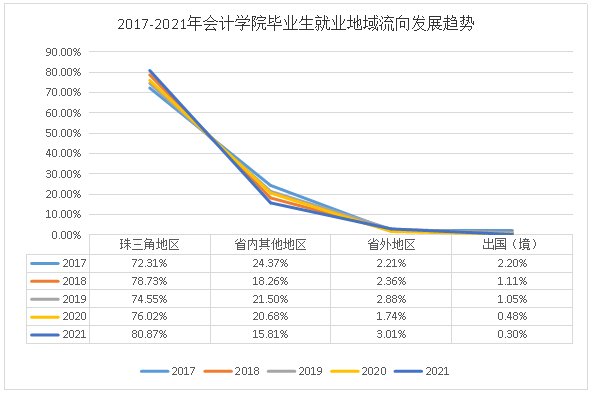Beat365官方网站2021届毕业生就业地域大部分集中在珠三角地区,占80.87%,其中在广州市就业人数占已就业人数的49.7%,粤东西北地区15.81%,外省地区3.01%,出国出境0.3%。